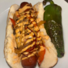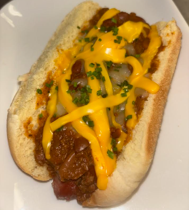 A savory sausage served in a soft bun, topped with hearty chili and melted cheese.
