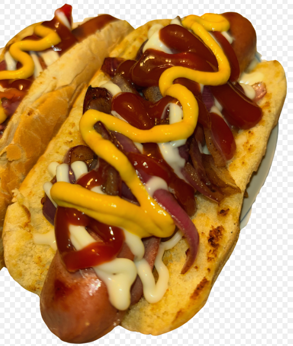 A savory sausage served in a soft bun, topped with mayonnaise, mustard, and ketchup.